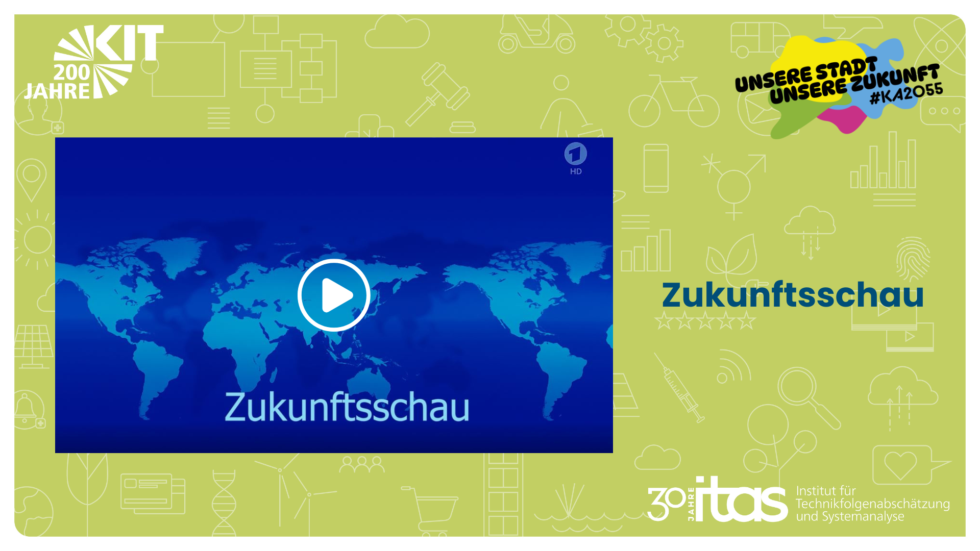 Wir haben die Zukunftsschau als Video produziert, das in der Form einer Nachrichtensendung die Weltlage und Innovationen im Jahr 2055 zeigt.